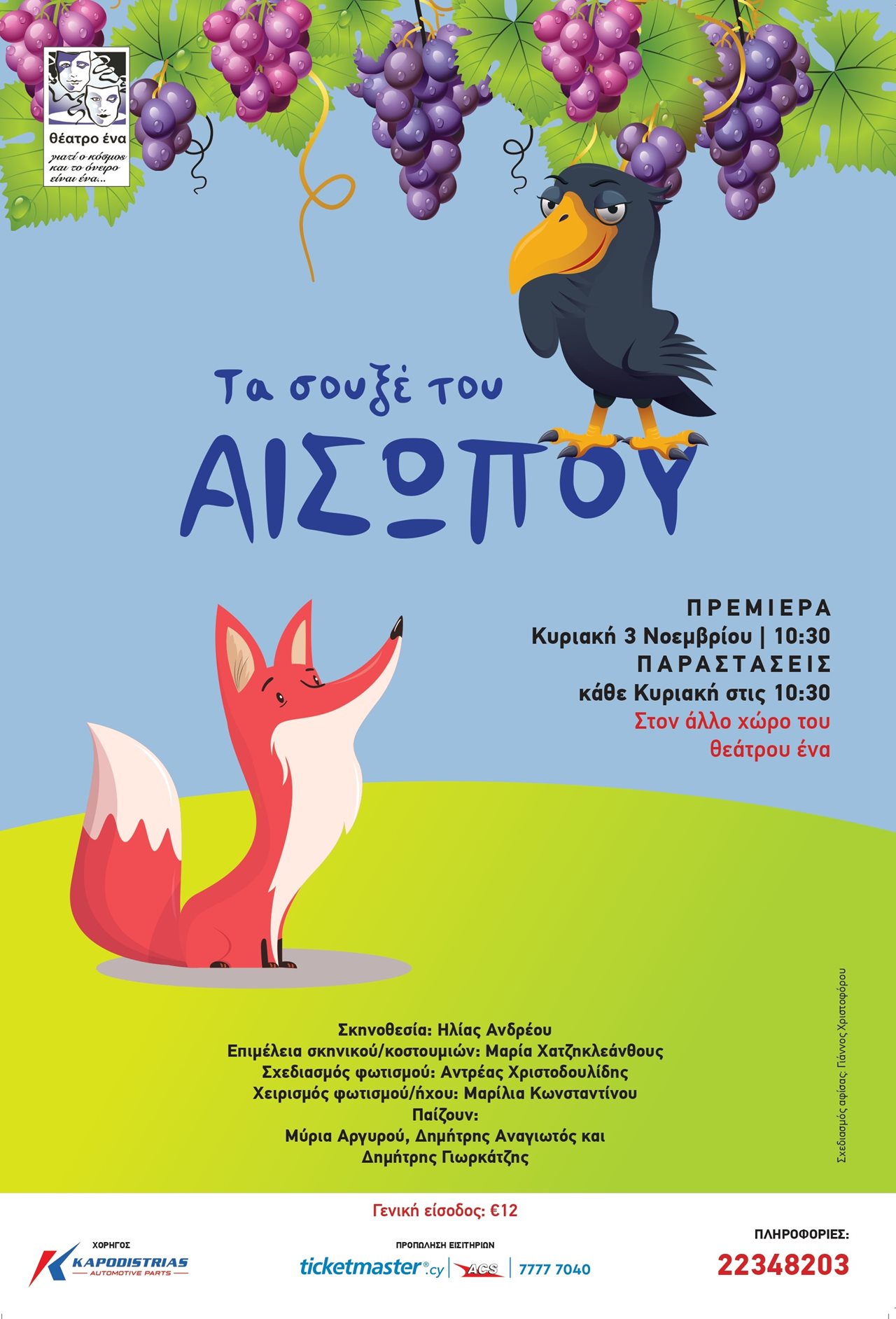 Το θέατρο ένα φέτος ανεβάζει την παιδική θεατρική παράσταση «Τα σουξέ του Αισώπου». Το κείμενο είναι μια διασκευή από τα κλασικά παραμύθια του Αισώπου. O Τίτος, η Νίνα και ο Τέλης με το κέφι και την ενέργεια τους, αφηγούνται και αναπαριστούν ιστορίες τις οποίες όλοι μάθαμε μεγαλώνοντας.