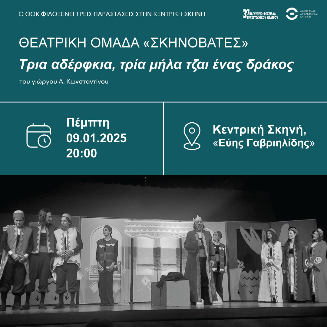 O Θεατρικός Οργανισμός Κύπρου συγχαίρει όλους τους συμμετέχοντες στο 37ο Παγκύπριο Φεστιβάλ Ερασιτεχνικού Θεάτρου και τιμώντας τους, προσκαλεί το κοινό, να απολαύσει δωρεάν τις τρεις παραστάσεις, που επιλέγηκαν από την Καλλιτεχνική Επιτροπή του Φεστιβάλ για να παρουσιαστούν στην Κεντρική Σκηνή «Εύης Γαβριηλίδης», στο Θέατρο ΘΟΚ, στις 7, 8 και 9 Ιανουαρίου 2025.