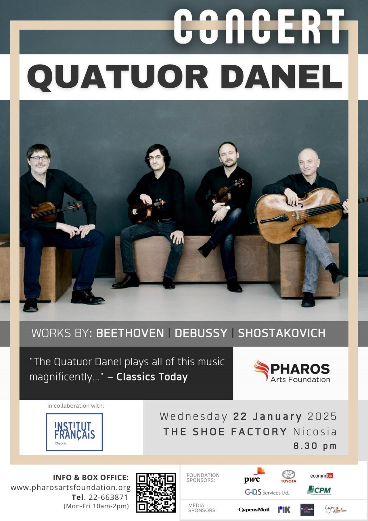 Έχοντας τοποθετηθεί στο προσκήνιο της διεθνούς κλασικής μουσικής σκηνής εδώ και δεκαετίες, με τις τολμηρές, εκφραστικές και άρτιες τεχνικά ερμηνείες του, το Quatuor Danel έχει εμφανισθεί σε όλες τις σημαντικές συναυλιακές αίθουσες ανά το παγκόσμιο, από τη Φιλαρμονική του Παρισιού στο Γκεβάντχαους της Λειψίας, από τη Φιλαρμονική του Έλβα στο Αμβούργο στο Γουίγκμορ Χολ του Λονδίνου, όπου το Κουαρτέτο διατελεί καλλιτέχνης-εν-διαμονή. Κατά τα τελευταία 30 χρόνια, η φρέσκια προσέγγισή του Quatuor Danel σχετικά με το παραδοσιακό ρεπερτόριο του κουαρτέτου εγχόρδων του χάρισε διθυραμβικές κριτικές από τον τύπο και τους ακροατές, και έχει επευφημηθεί για την πρωτοποριακή, πολυβραβευμένη δισκογραφία του – ειδικά, για τις μύχιες αποδόσεις του στους κύκλους των κουαρτέτων εγχόρδων των Χάιντν, Μπετόβεν, Σούμπερτ, Σοστακόβιτς και Βάινμπεργκ. Ανοίγοντας τη σαιζόν 2025, το Ίδρυμα Τεχνών Φάρος υποδέχεται το θρυλικό Quatuor Danel, το οποίο θα κάνει το ντεμπούτο του στην Κύπρο σε ένα συναρπαστικό πρόγραμμα με κουαρτέτα εγχόρδων των Μπετόβεν, Ντεμπισί και Σοστακόβιτς. Η συναυλία θα πραγματοποιηθεί την Τετάρτη 22 Ιανουαρίου 2025 στο The Shoe Factory, Λευκωσία / 8:30μμ, και οργανώνεται σε συνεργασία με το Institut français de Chypre.
