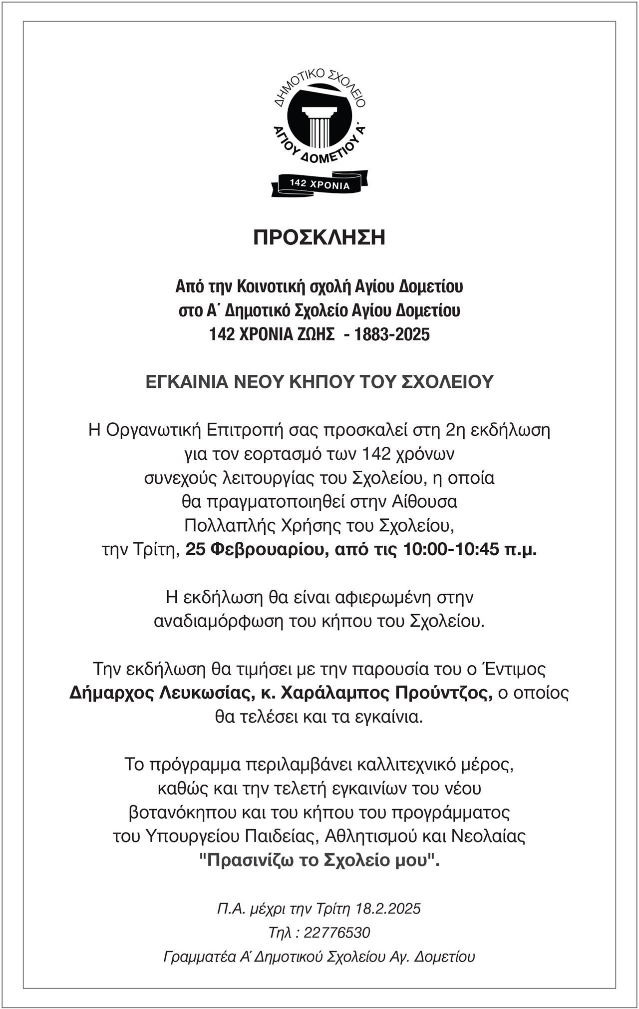 Η Οργανωτική Επιτροπή σας προσκαλεί στη 2η εκδήλωση για τον εορτασμό των 142 χρόνων συνεχούς λειτουργίας του Σχολείου, η οποία θα πραγματοποιηθεί στην Αίθουσα Πολλαπλής Χρήσης του Σχολείου, την Τρίτη 25 Φεβρουαρίου, από τις 10:00-10:45π.μ.