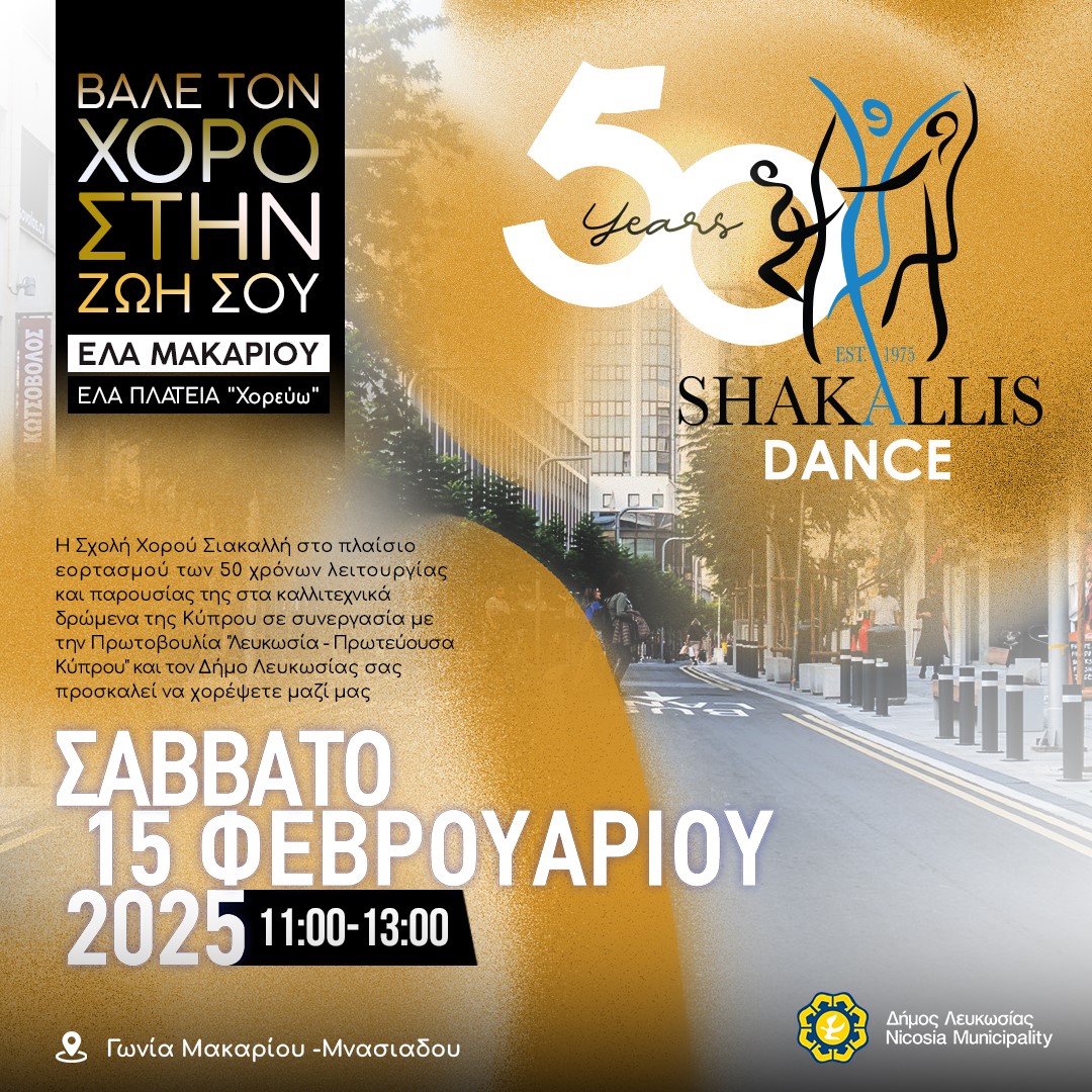 «Η Σχολή Χορού Σιακαλλή στο πλαίσιο εορτασμού των 50 χρόνων λειτουργίας και παρουσίας της στα καλλιτεχνικά δρώμενα της Κύπρου συμμετέχει στο κοινωνικό πρόγραμμα "Είναι όμορφα τα Σάββατα στο Κέντρο της πόλης" και σε συνεργασία με την Πρωτοβουλία "Λευκωσία - Πρωτεύουσα Κύπρου" και το Δήμο Λευκωσίας σας προσκαλεί να χορέψετε μαζί μας με σύνθημα “Βάλε τον χορό στην ζωή σου”.