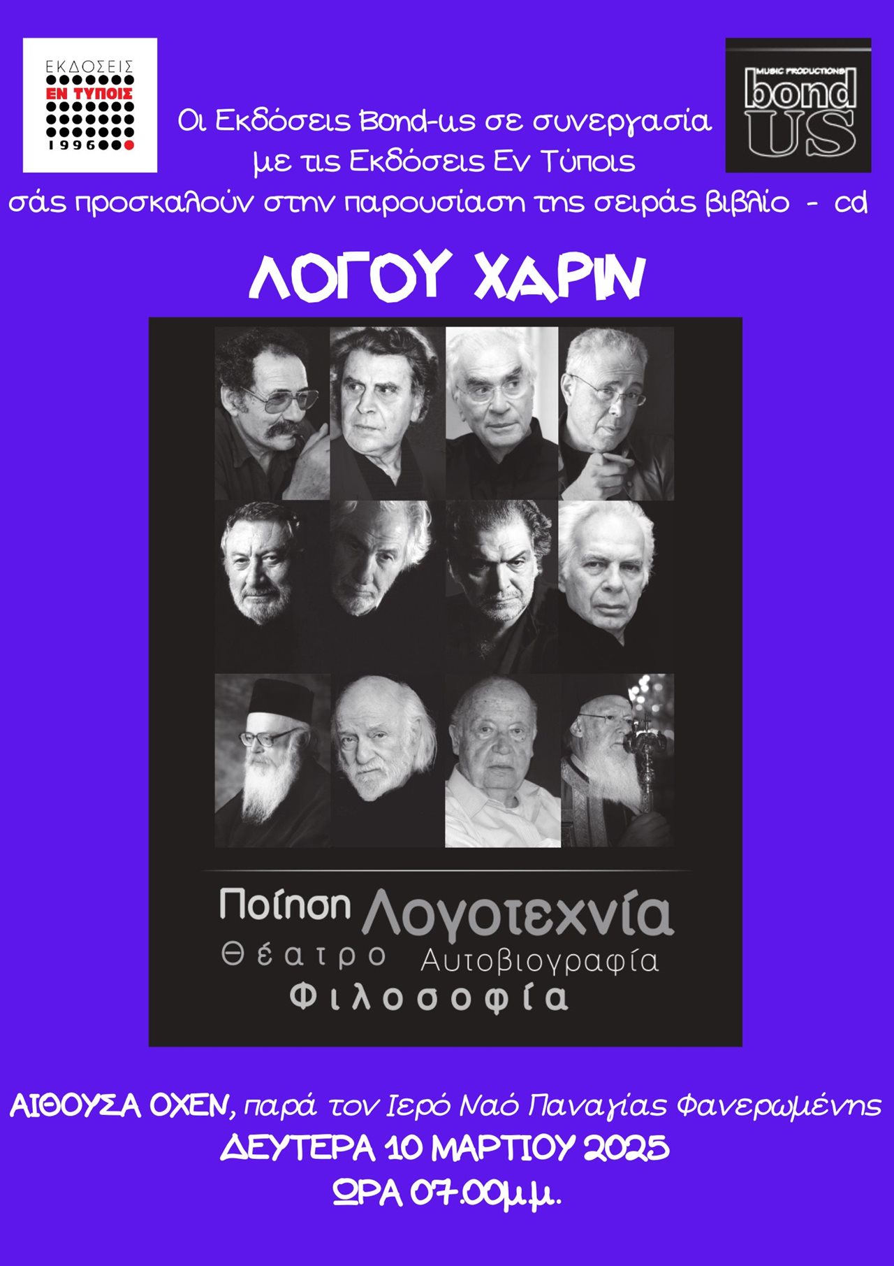 Οι Εκδόσεις Εν Τύποις σε συνεργασία με τις Εκδόσεις Bond-us σας προσκαλούν στην παρουσίαση της σειρας βιβλίο - cd ΛΟΓΟΥ ΧΑΡΙΝ, στην αίθουσα ΟΧΕΝ, παρά τον Ιερό Ναό Παναγίας Φανερωμένης την Δευτέρα 10 Μαρτίου και ώρα 19:00.