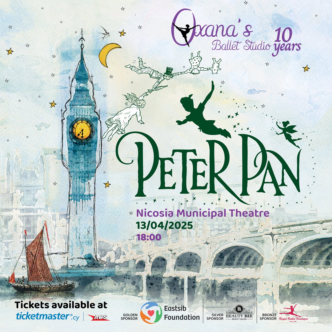 Η σχολή χορού Oxana's Ballet Studio παρουσιάζει τη χορευτική παράσταση «Peter Pan», μια μαγική εκδήλωση που σηματοδοτεί την επέτειο των 10 χρόνων λειτουργίας της σχολής! Το συναρπαστικό παραμύθι ακολουθεί την Γουέντι και τα αδέρφια της, Τζον και Μάικλ, από μια παιχνιδιάρικη μέρα στο Χάιντ Παρκ σε μια συναρπαστική περιπέτεια στη Χώρα του Ποτέ. Με οδηγό τον Πίτερ Παν και τη μαγεία της Τίνκερμπελ, πετούν στον ουρανό, αντιμετωπίζουν τον τρομερό Κάπτεν Χουκ και σώζουν την Τάιγκερ Λίλι σε μια ηρωική μάχη. Αυτή η συγκινητική παράσταση χορού για μικρούς και μεγάλους αποτυπώνει τη χαρά της παιδικής ηλικίας και τη μαγεία της φαντασίας. Μην χάσετε αυτό το αξέχαστο αφιέρωμα σε μια δεκαετία χορού και δημιουργικότητας!