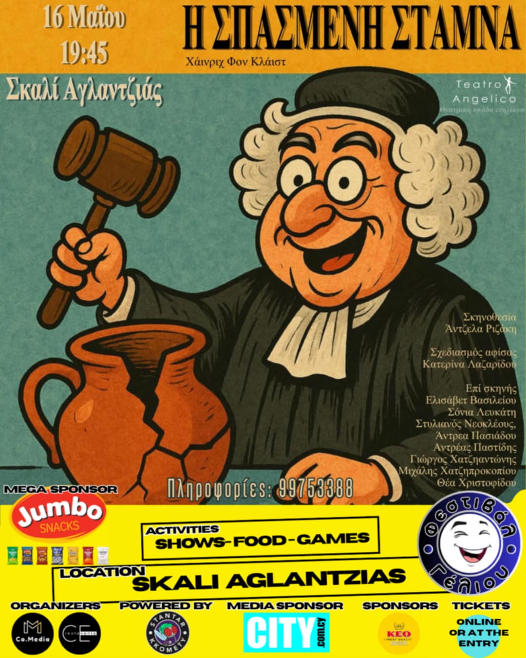 Mε μεγάλη χαρά η θεατρική ομάδα ενηλίκων Teatro Angelico, θα βρίσκεται στο φεστιβάλ γέλιου, παρουσιάζοντας την κωμωδία του Χάινριχ Φον Κλάιστ, "Η Σπασμένη Στάμνα" την Παρασκευή 16 Μαϊου 2025, στις 19:45, στο Σκαλί Αγλαντζιάς, για ΜΙΑ ΜΟΝΟ ΠΑΡΑΣΤΑΣΗ!