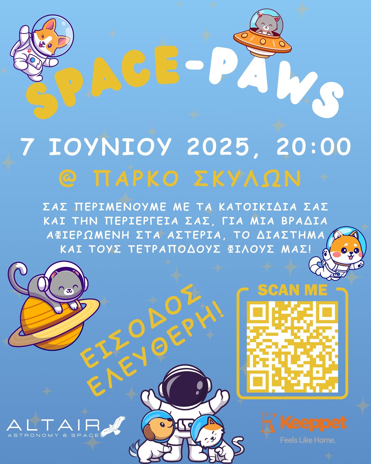Μια νύχτα αστρονομίας με τους τετράποδους φίλους μας, αποτελεί μια συνεργασία μεταξύ του οργανισμού Altair Astronomy και της Keeppet. Πρόκειται για μια ανοικτή, δωρεάν βραδιά αστρονομικής παρατήρησης, η οποία θα πραγματοποιηθεί το Σάββατο 7 Ιουνίου 2025, στις 20:00, στον χώρο του Πάρκου Σκύλων στην τάφρο της Πύλης Αμμοχώστου, Λεωφ. Σαλαμίνος.