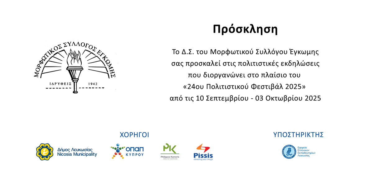 Ο Μορφωτικός Σύλλογος Έγκωμης στο πλαίσιο της πολιτιστικής του προσφοράς προς τους δημότες της Λευκωσίας, αποφάσισε όπως διοργανώσει και φέτος (για 24η συνεχή χρονιά) σειρά πολιτιστικών εκδηλώσεων με την ονομασία “Πολιτιστικό Φθινόπωρο 2025”.