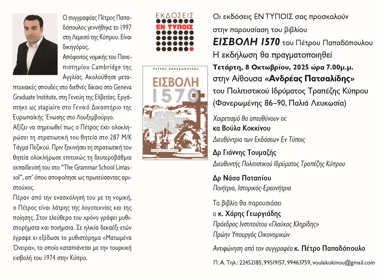 Οι Εκδόσεις Εν Τύποις σας προσκαλούν στην παρουσίαση του βιβλίου ΕΙΣΒΟΛΗ 1570 του Πέτρου Παπαδόπουλου, στις 8 Οκτωβρίου 2025 ώρα 7:00μ.μ. στην αίθουσα "Ανδρέας Πατσαλίδης" του Πολιτιστικού Ιδρύματος Τραπέζης Κύπρου (Φανερωμένης 96-90, Παλιά Λευκωσία).