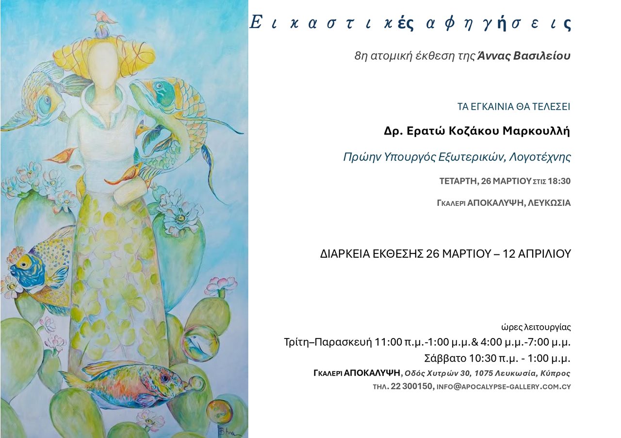 Τα εγκαίνια της έκθεσης θα γίνουν την Τετάρτη, 26 Μαρτίου 2025 στην γκαλερύ Αποκάλυψη στις 18:30 και θα τα τελέσει η πρώην Υπουργός Εξωτερικών και λογοτέχνης Δρ. Ερατώ Κοζάκου Μαρκουλλή.