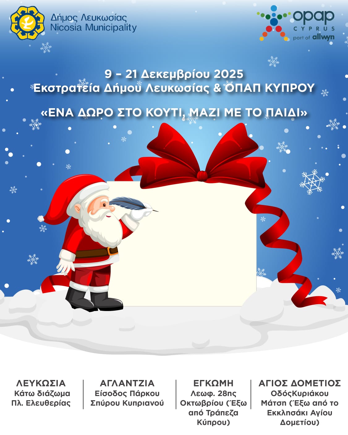 Ο Δήμος Λευκωσίας, σε συνεργασία με την ΟΠΑΠ Κύπρου, πραγματοποιεί για δεύτερη συνεχόμενη χρονιά, την γιορτινή εκστρατεία κοινωνικής προσφοράς «Ένα Δώρο στο Κουτί, Μαζί με το Παιδί», με στόχο τη συλλογή δώρων για παιδιά που το έχουν ανάγκη.