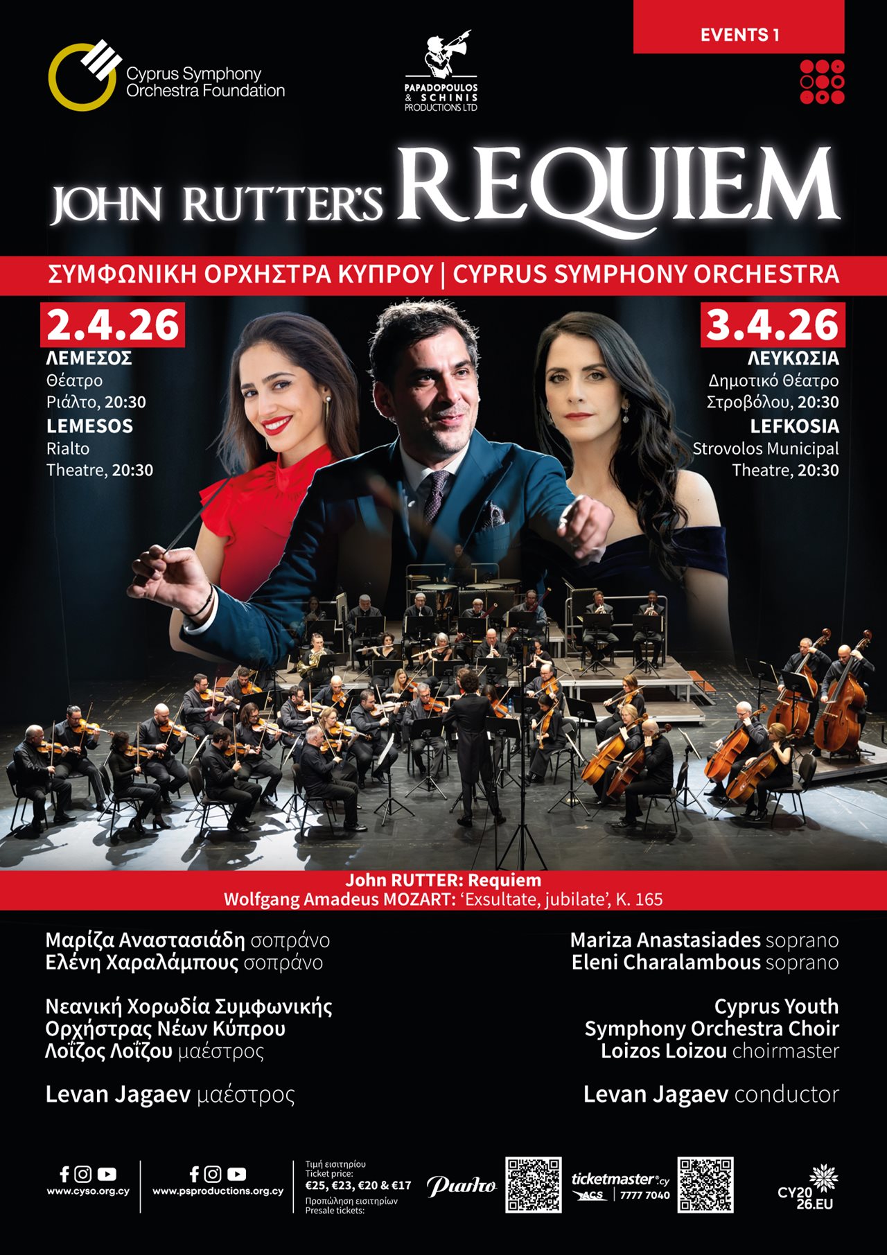 Ακριβώς για αυτό τον λόγο, το Requiem του Rutter έχει ευρεία συναισθηματική απήχηση και αγγίζει διαχρονικά την καρδιά του κάθε ακροατή. Για να επικοινωνήσουν τα βαθιά, πανανθρώπινα του μηνύματα, η Συμφωνική Ορχήστρα Κύπρου συμπράττει επι σκηνής με τον εξαίρετο Γεωργιανό μαέστρο Levan Jagaev, τις διακεκριμένες σοπράνο Μαρίζα Αναστασιάδη και Ελένη Χαραλάμπους, καθώς και τη Νεανική Χορωδία της Συμφωνικής Ορχήστρας Νέων Κύπρου.