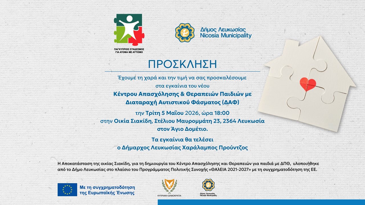 ΕΝΗΜΕΡΩΣΗ / Εκδηλώσεις / Εκδηλώσεις / Εκδηλώσεις 2026 / Μάιος / Εγκαίνια του νέου Κέντρου Απασχόλησης & Θεραπειών Παιδιών με Διαταραχή Αυτιστικού Φάσματος