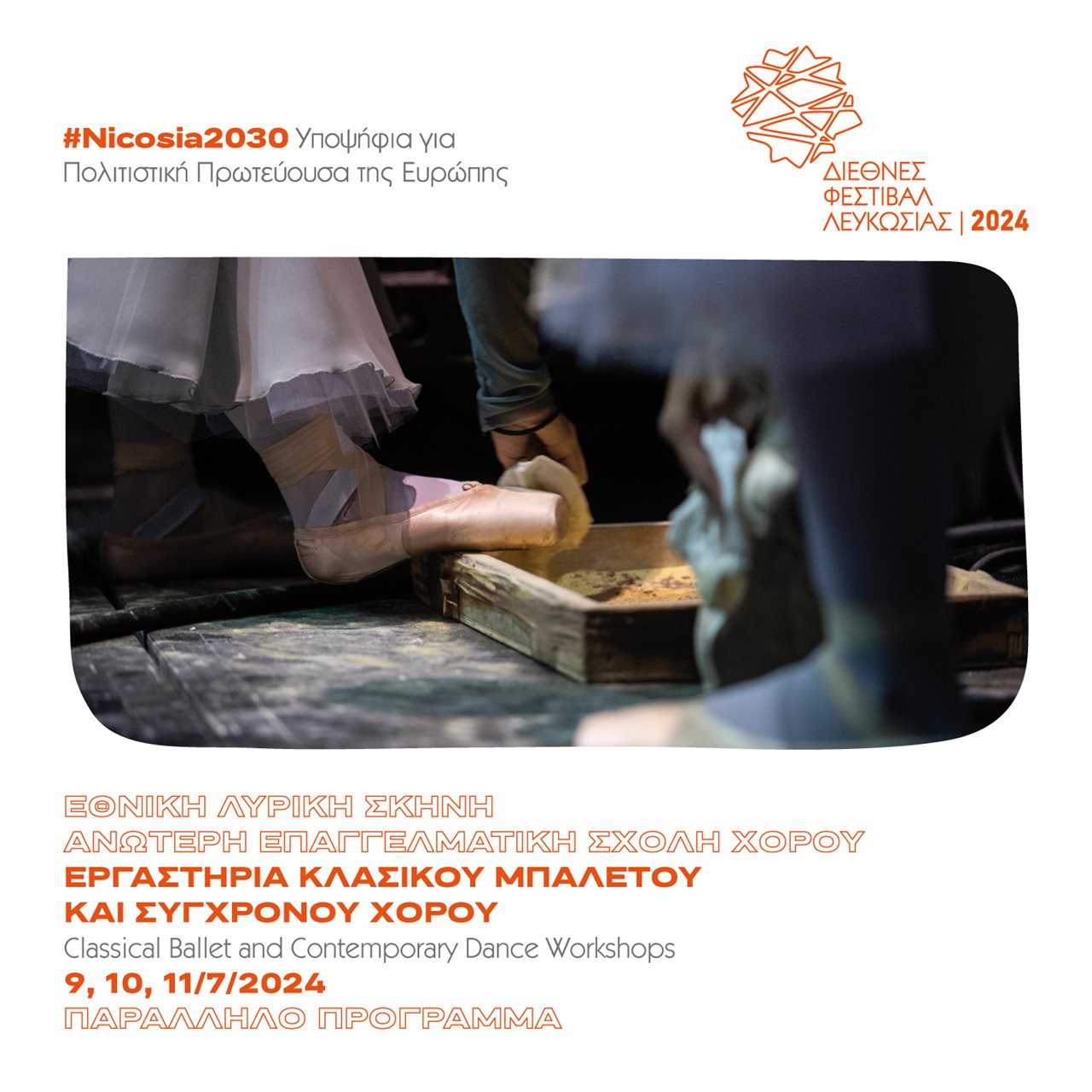 Nicosia 2030, the Nicosia International Festival and the Greek National Opera (GNO) Professional Dance School, offer free workshops of classical ballet and contemporary dance on 9,10 and 11 July 2024.